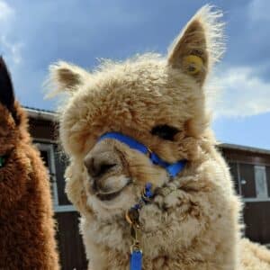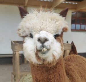 Mowgli er ofte den af vores alpacaer, som først kommer og hilser på gæsterne. Og indimellem vælger han selv, hvem han gerne vil gå med.