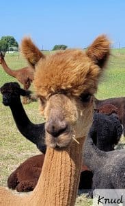 Knud er selvudnævnt vagtmand og ham der holder øje med omgivelserne når vi er på tur. Knud er en alpaca der ved hvad han vil og står ved sine meninger. Knud er mageligt anlagt og ligger ofte ned når han spiser.