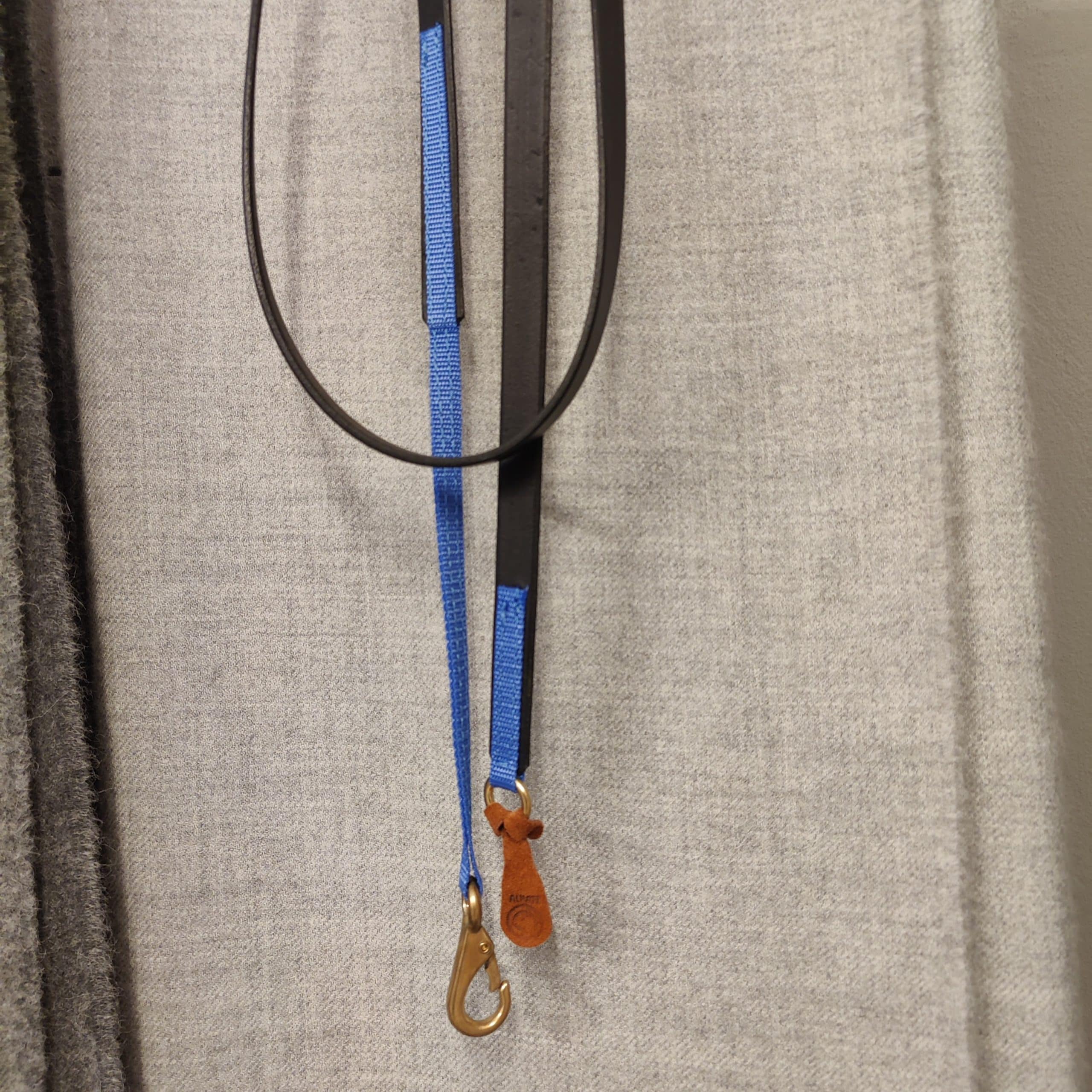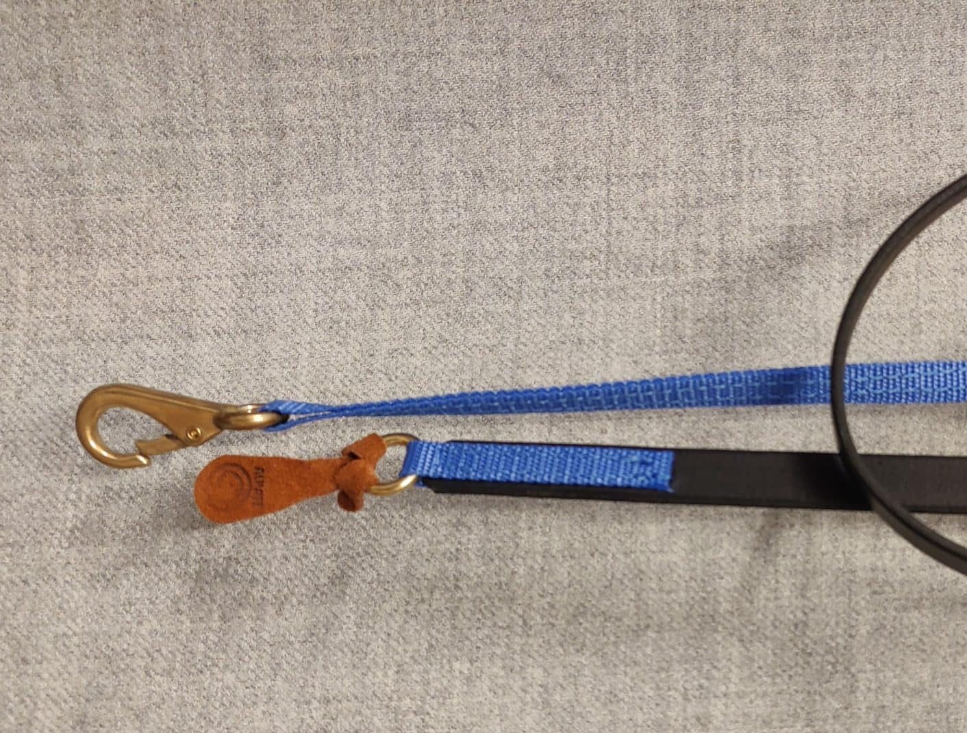 Sort kerne læder. Karabinhage og ring i messing. Nylon i henholdsvis sort, blå, grøn grå.